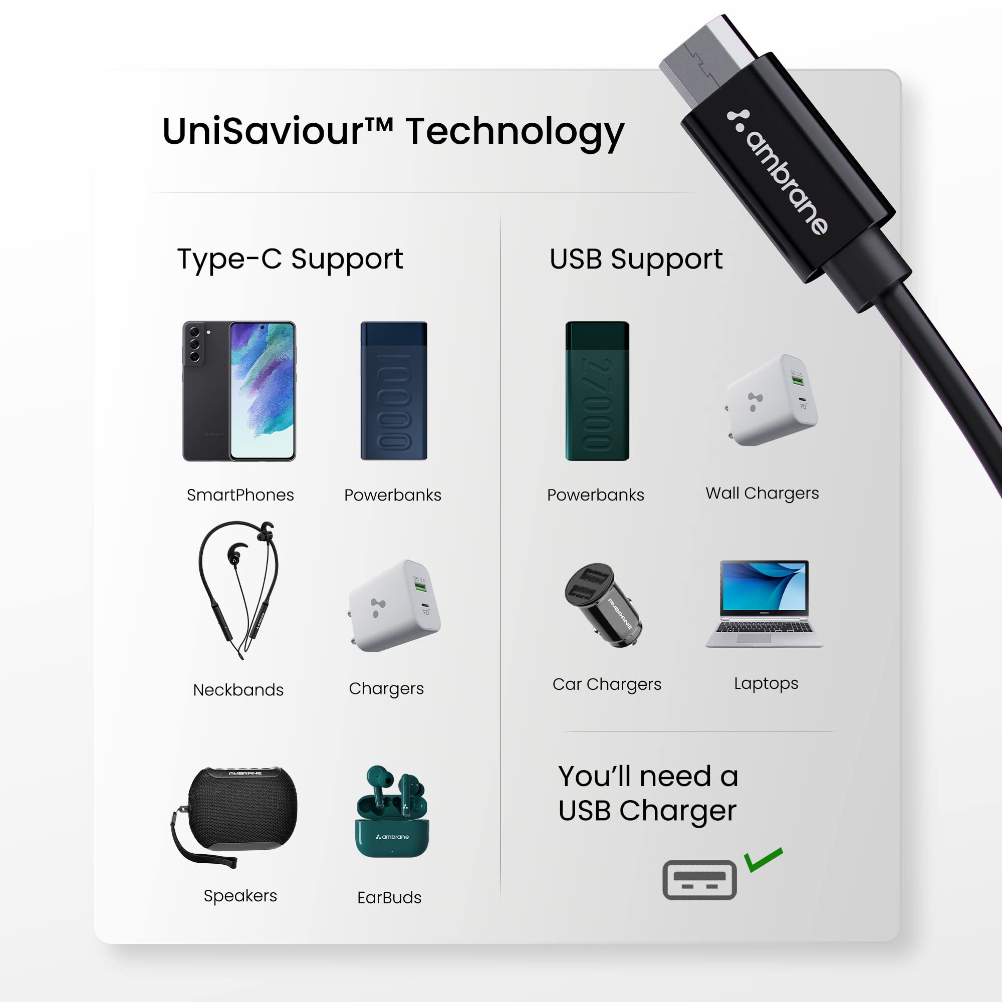 - Durable Cable- Using only premium quality materials and a tough, durable PVC Coating, the Ambrane USB cable is built for connecting and disconnecting over and over again without signal loss.