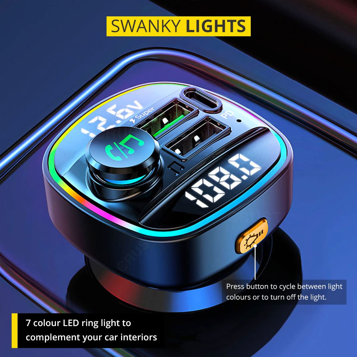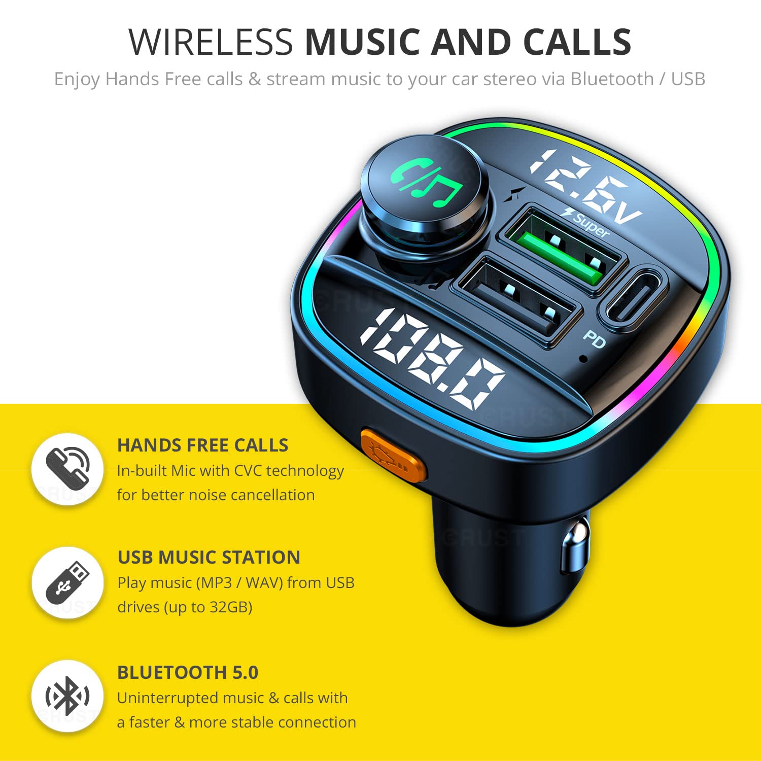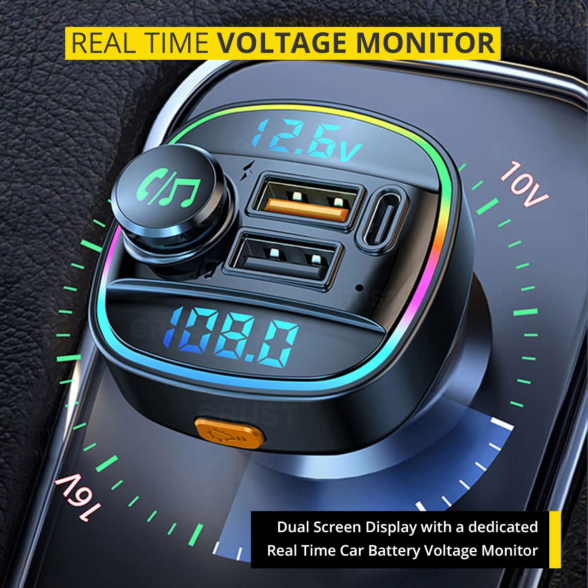 CRUST CS45 Car Bluetooth Device for Music System, FM Transmitter with Call Receiver; (PD 20W + QC3.0) Fast Charger; Real Time Car Battery Voltage Monitor; 7 Colour LED Lights; USB MP3 Audio Playback
