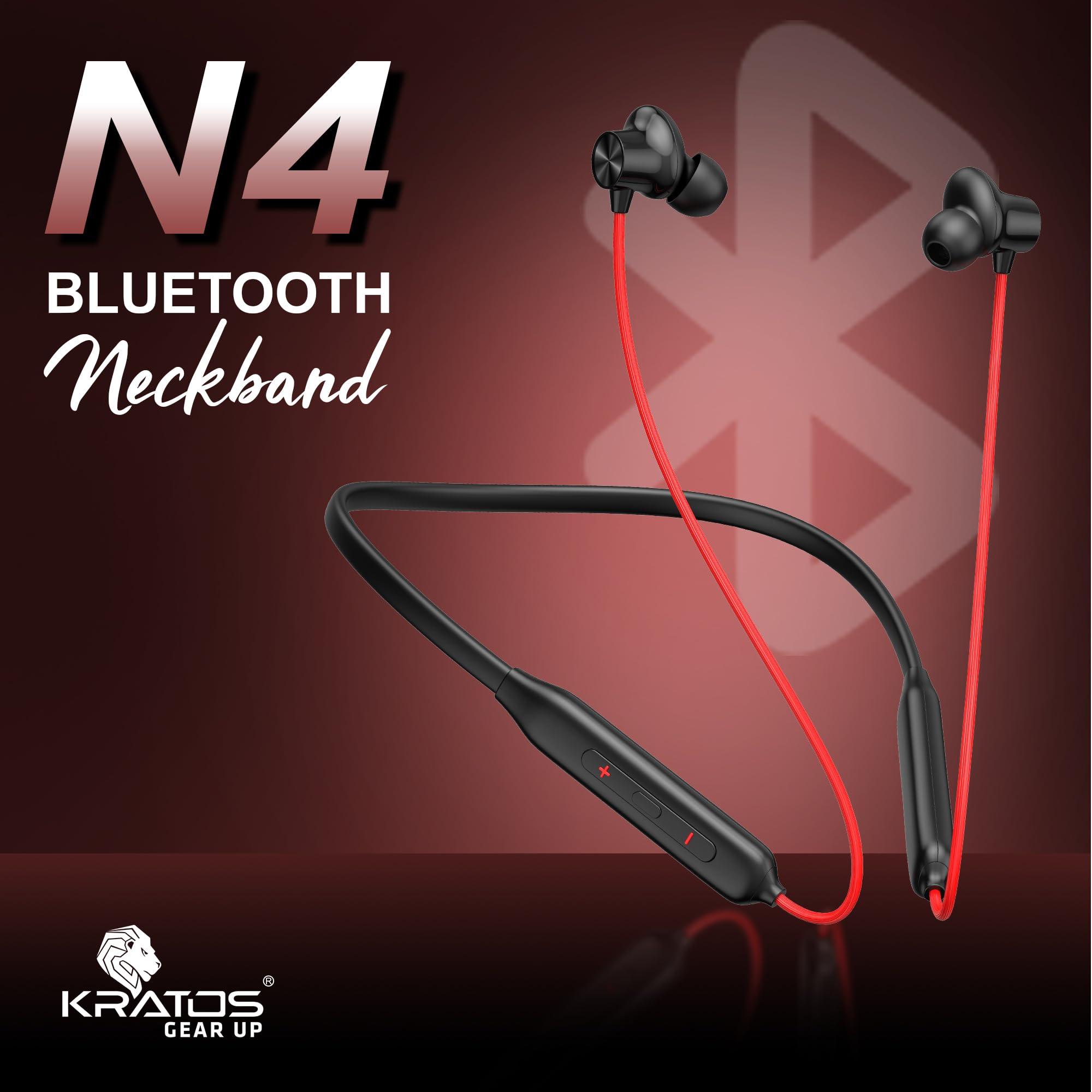 Kratos N4 Bluetooth Neckband with 52H Playtime, Deep Bass, Stereo Sound, HD Calls, Magnetic Earbuds, Type-C Fast Charging, Rich Audio, Hollow Switch for Comfort & Style