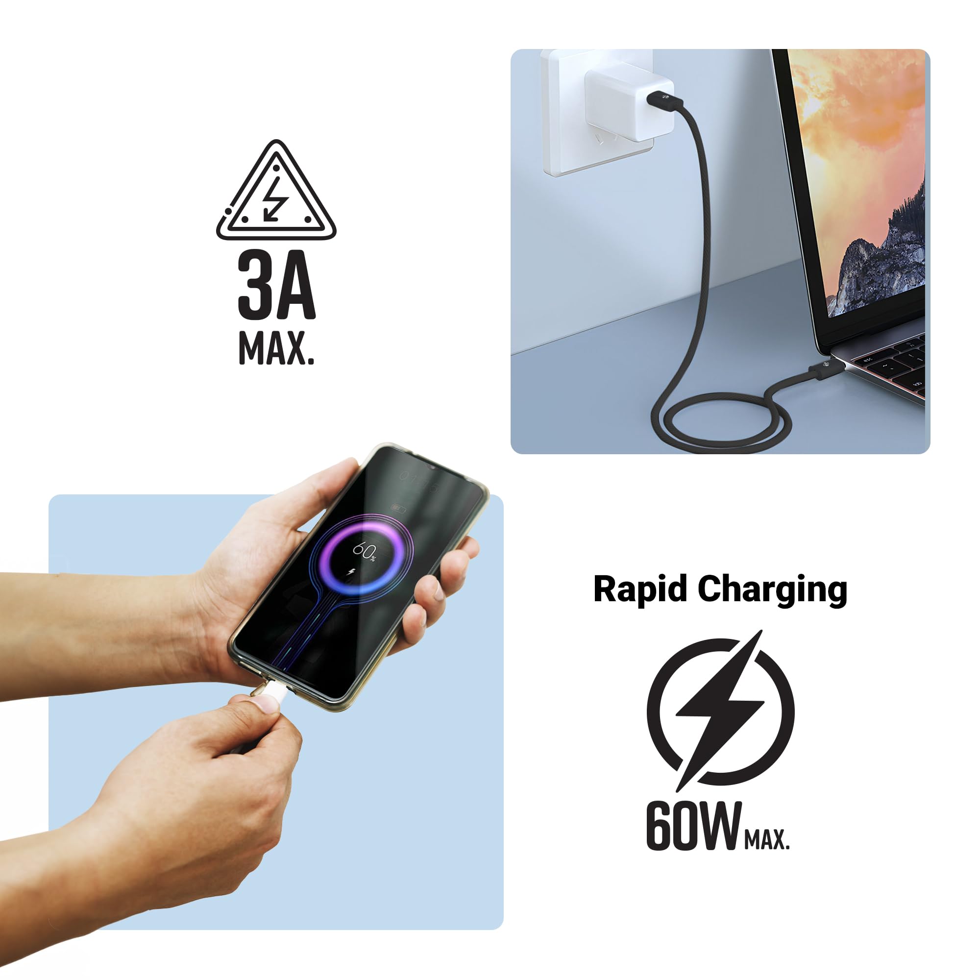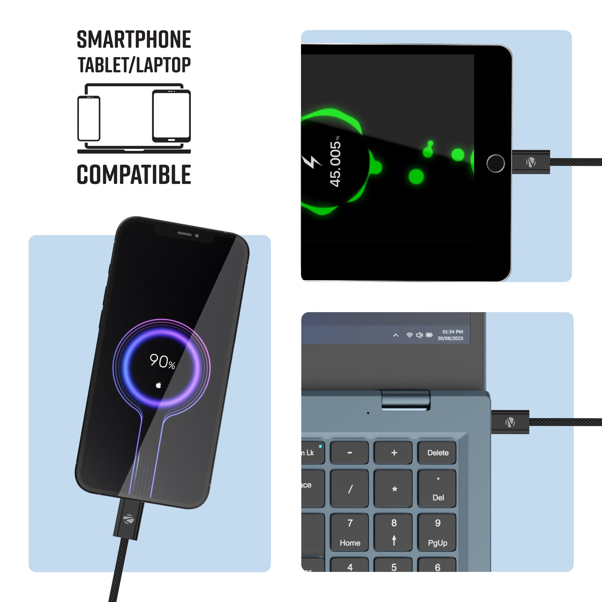 ZEBRONICS TT60+ Type C – Type C Braided Cable, 60 Watts, Rapid Charging, Charge & Sync, 1 Meter, Compatible with iPhone 15 | Samsung | OnePlus | Xiaomi | Realme | Oppo Black